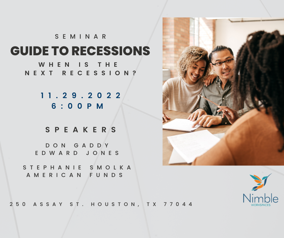 Learn what factors have contributed to previous recessions, how close is the next recession, and much more at the Guide to Recessions seminar on November 29th, at 6:00pm. Co-Hosted by Edward Jones Financial Advisor Don Gaddy and Stephanie Smolka of American Funds. Please RSVP to jeff.plymale@edwardjones.com or call 281-436-1420.